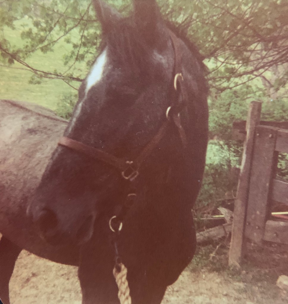 Alas, the poor creature was very ill. Amy’s Mom, an assertive horsewoman convinced the owner to make good for this little twelve-year-old redhead. He substituted a finer, healthy pony, a two-year-old Welsh-Thoroughbred filly. I thought she was beautiful. She was a shiny Blue Roan which is essentially a black horse peppered with lots of silver-white hairs. She had a bright white star in the center of her forehead. I named her Seamist at first then changed it to Mystic Trinity, as I’d recently received the Children’s Living Bible and was learning about God. I called her Misty for short, and over the next year with Amy’s help I trained her, eventually showing, eventing and Pony-Clubbing.
